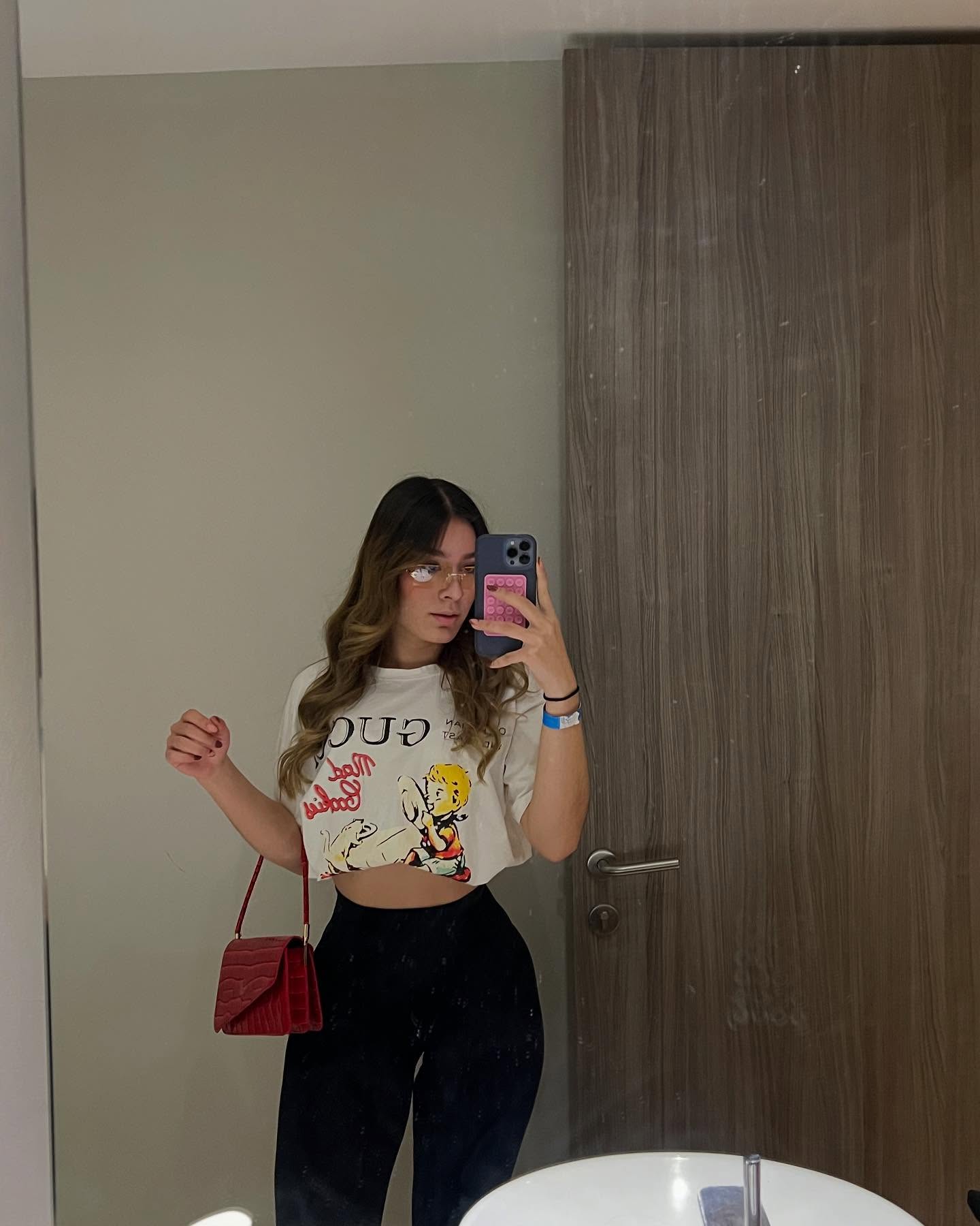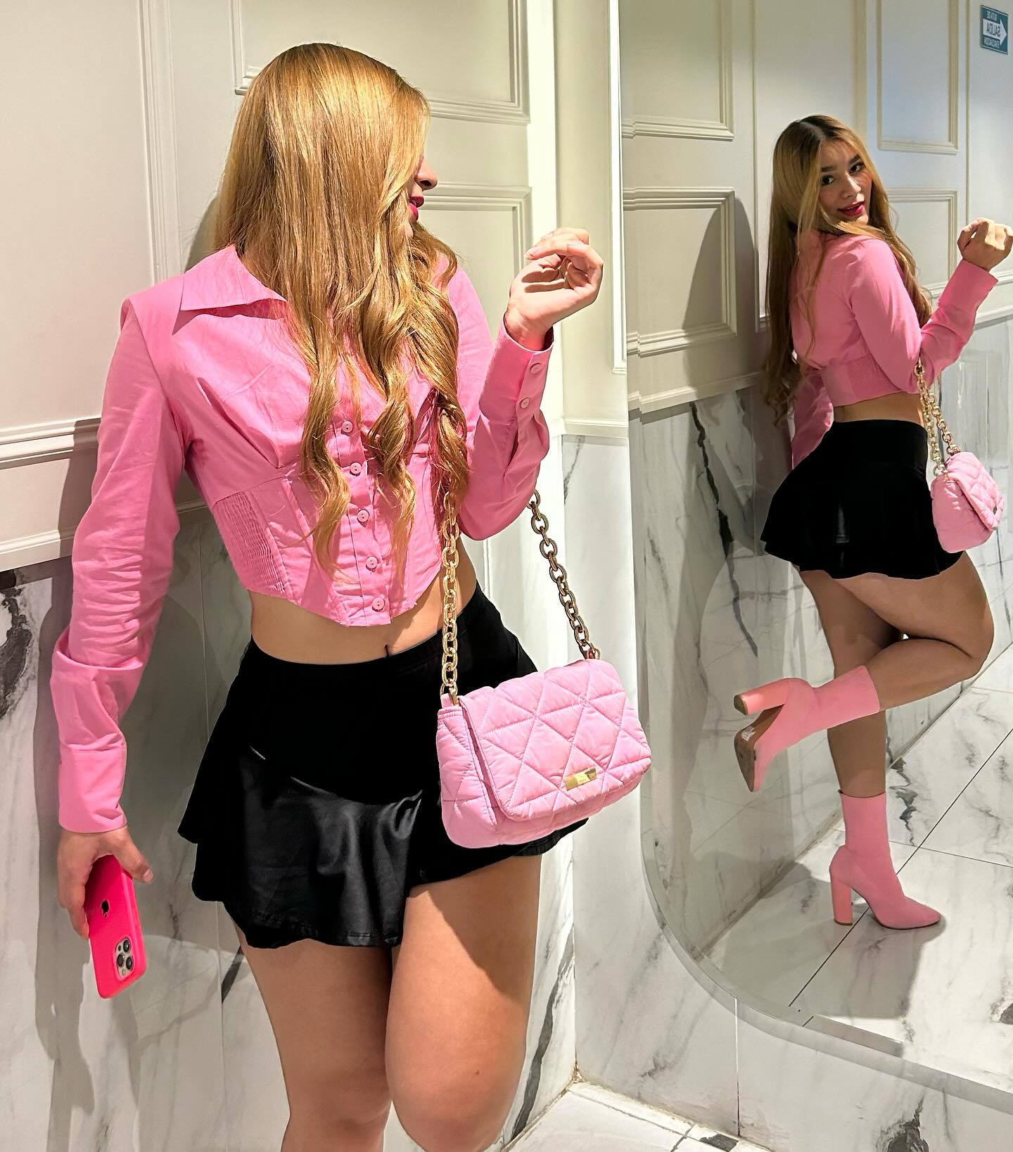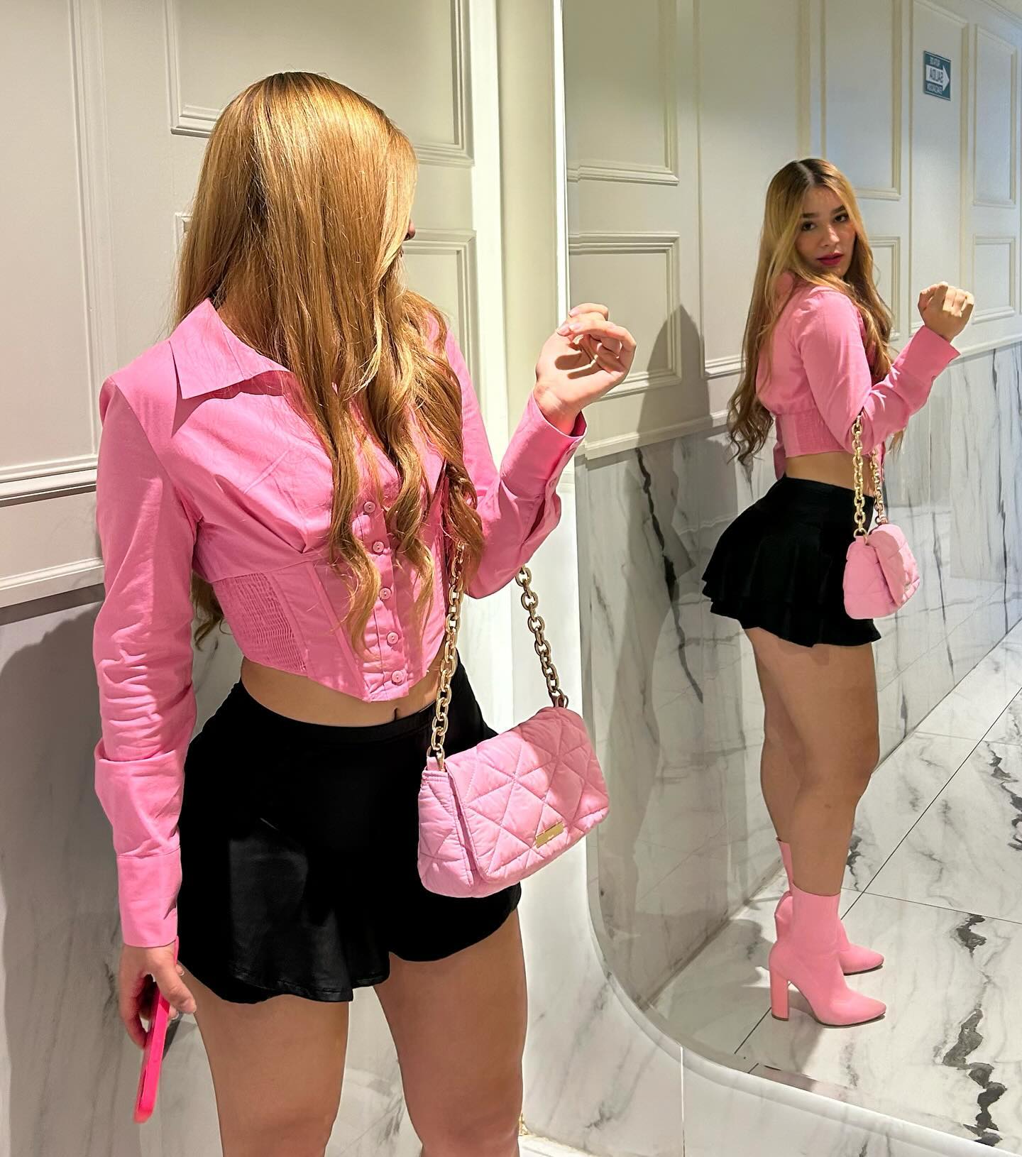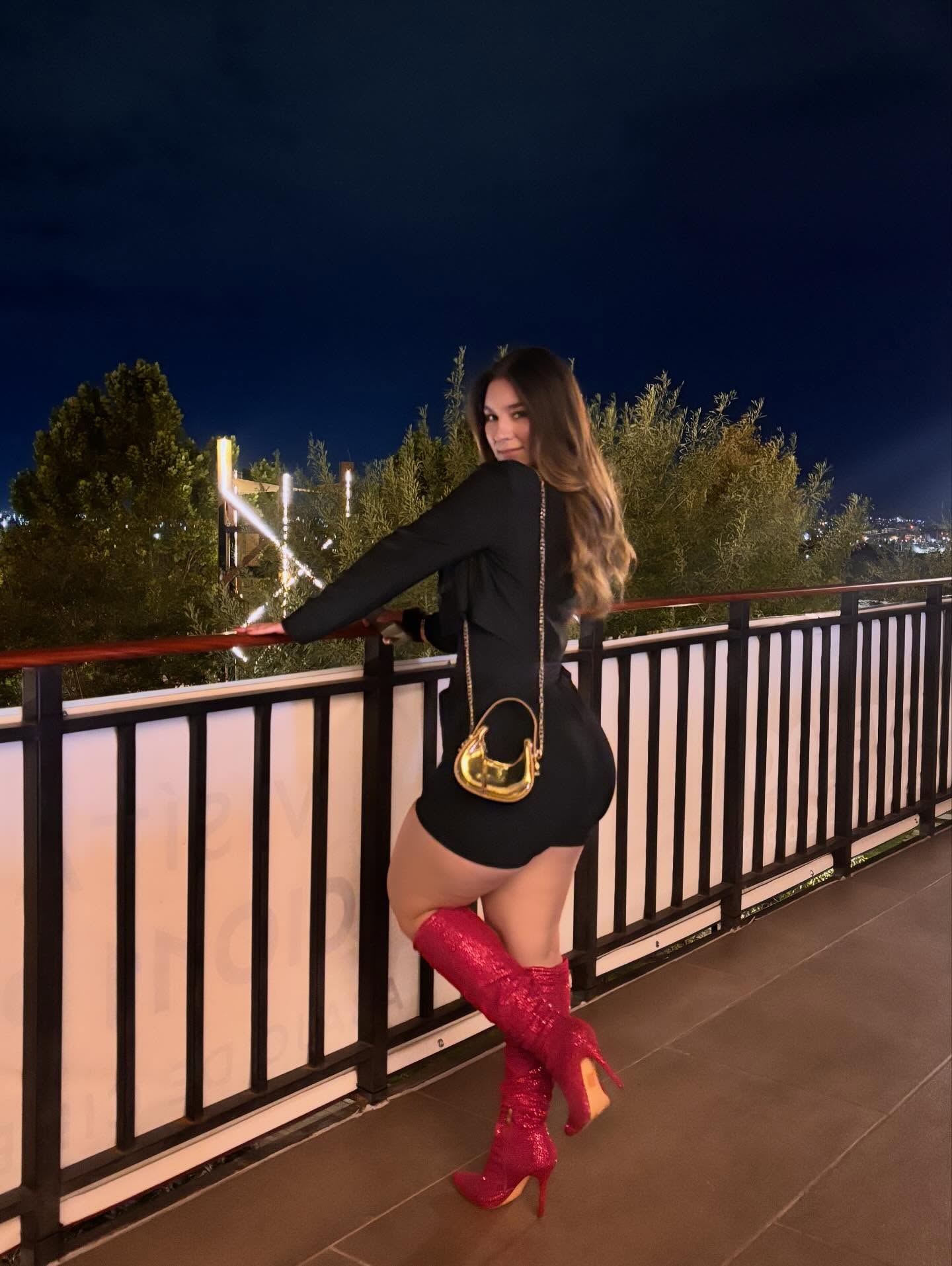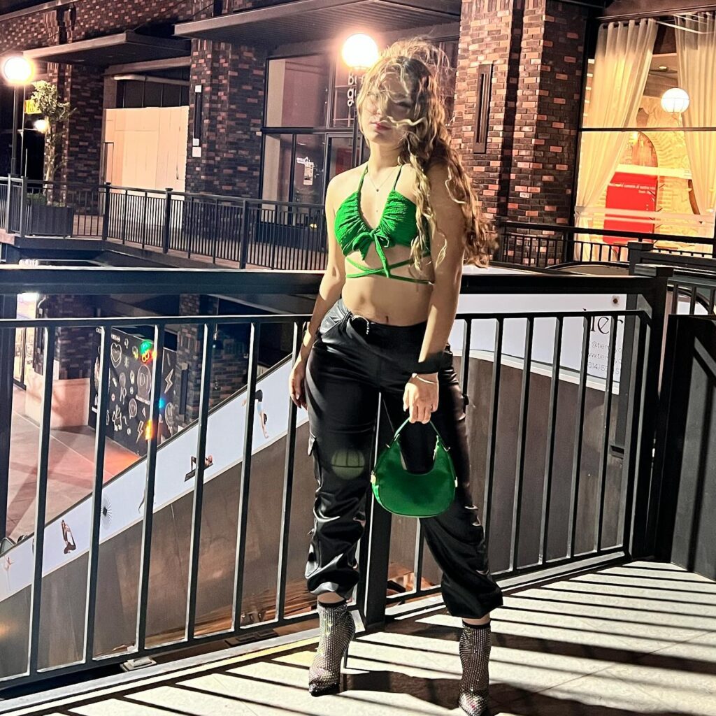The image captures a vibrant moment of urban nightlife, centered on a young woman descending an outdoor escalator. The perspective is from behind and slightly above, creating a dynamic sense of motion that pulls the viewer into the scene. She is turned toward the camera with a confident, over-the-shoulder glance, her long, honey-blonde curls cascading down her back and catching the warm ambient glow of the city lights. Her outfit is a bold study in contrast and texture, featuring a vibrant emerald-green bikini-style top with delicate string ties that stand out sharply against her skin and the dark, sleek material of her high-waisted trousers. The trousers appear to be made of a reflective, leather-like fabric, catching the highlights of the surrounding environment and emphasizing the curve of her silhouette.